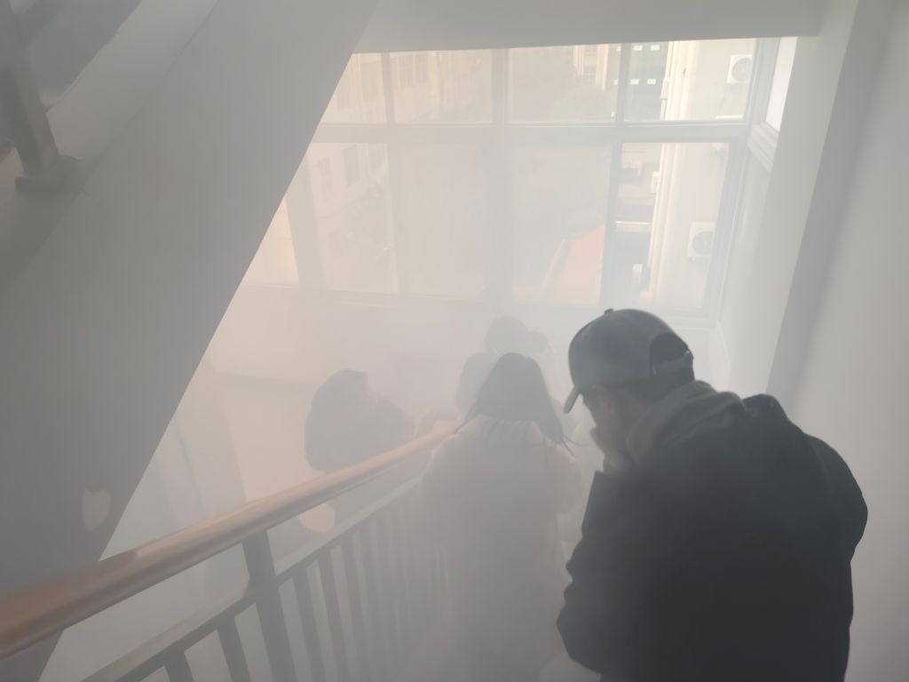 演练现场,模拟着火点释放烟雾,公司接到火警信号后,所在办公楼值班人员和实验室管理员立刻通知各楼层师生,利用口罩、湿纸巾等捂住口鼻,走疏散通道,有序从安全出口逃离现场。公司保卫处迅速进行现场灭火救援。