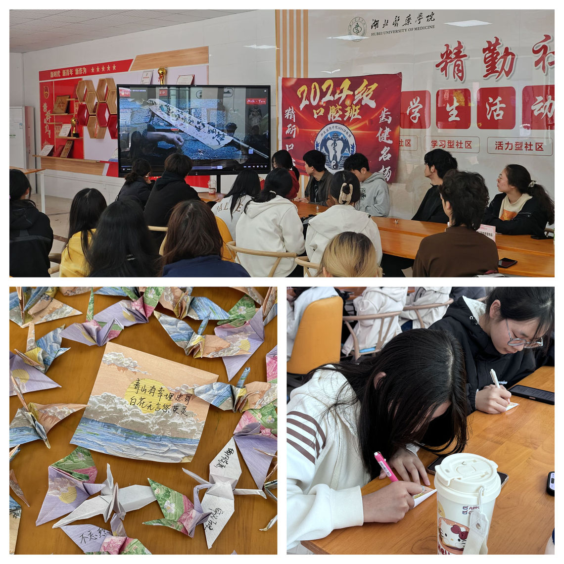 活动现场的氛围庄重而温馨,同学们于信笺间写下对革命英烈的追思,并将它们叠成一个个千纸鹤,千纸鹤寄托了学子们对革命先烈深深的思念和敬仰之情。随后,大家共同观看了爱国主题影片。影片中先烈们英勇无畏、舍生忘死的英勇事迹深深触动了在场的每一位同学。